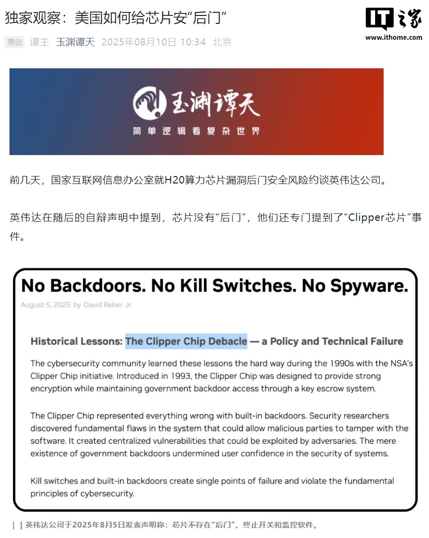 IT之家 8 月 11 日音信,中央播送电视总台旗下的新媒体账号“玉渊谭天”8 月 10 日发文《独家不雅察:好意思国怎样给芯片安“后门”》。