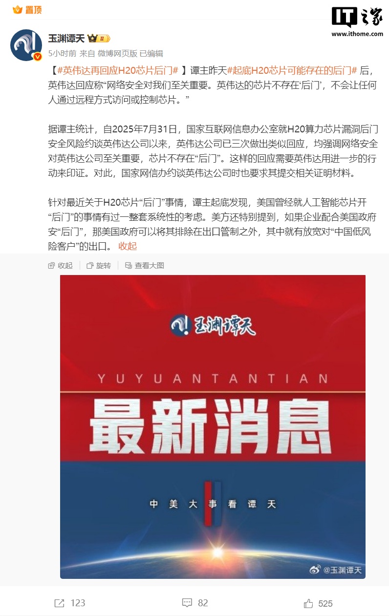 IT之家注释到,自 2025 年 7 月 31 日,国度互联网信息办公室就 H20 算力芯片时弊后门安全风险约谈英伟达公司以来,英伟达公司已三次作念出一样陈说,均强调网罗安全对英伟达公司至关进击,芯片不存在“后门”。